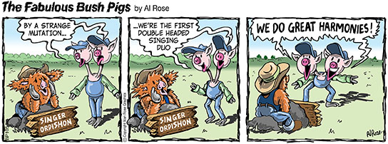 No 113 Sow Wester 1 My new favourite character… Sow Wester! The sow with the biggest voice in the outback! She’ll bowl you over and blow you away at the same time! A guest singer with wind power. Sowest 1 Share this: Click to email a link to a friend (Opens in new window) Email TweetShare on Tumblr Click to share on Reddit (Opens in new window) Reddit Like Loading...