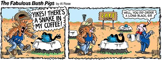 Snake in Coffee Snake In Coffee The single reptilious”Snake in Coffee” cartoon strip. Teaser “The Fabulous Bush Pigs meet Toby and the Magic Pencil” Comic 3, “The Fabulous Bush Pigs meet Toby and the Magic Pencil” OUT NOW!!! Share this: Click to email a link to a friend (Opens in new window) Email TweetShare on Tumblr Click to share on Reddit (Opens in new window) Reddit Like Loading...